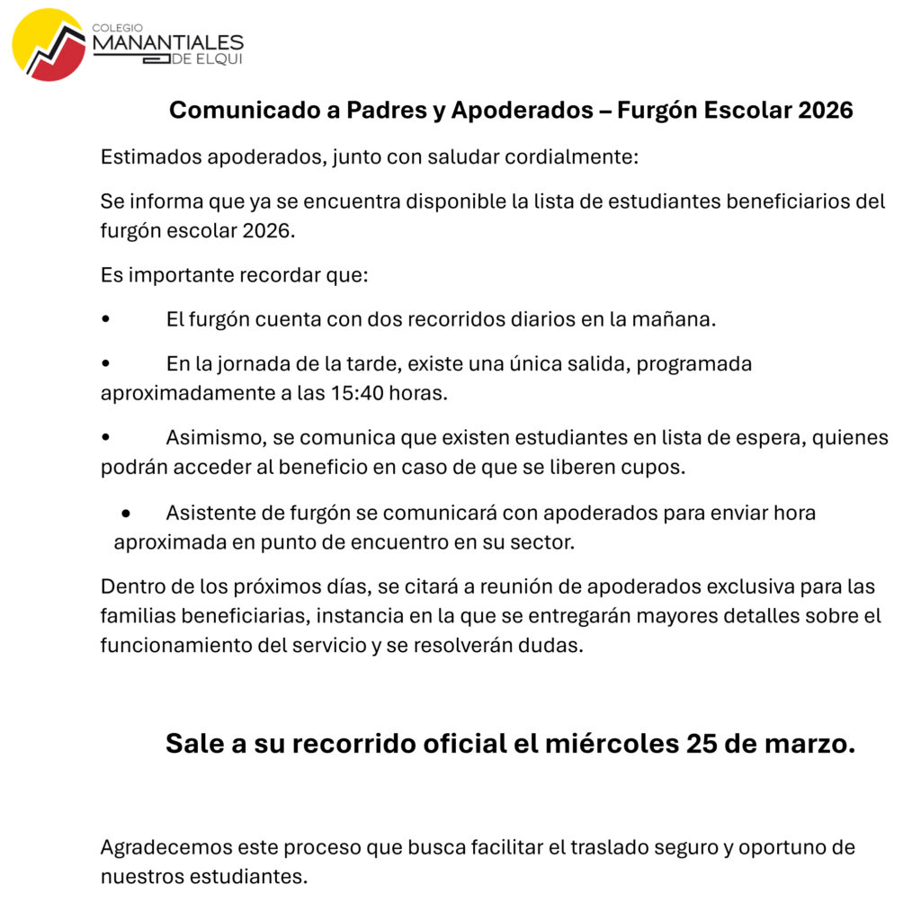 Nuestro colegio Manantiales de Elqui, en virtud de los excelentes resultados obtenidos por el actual 3ºMedio en el SIMCE pasado…