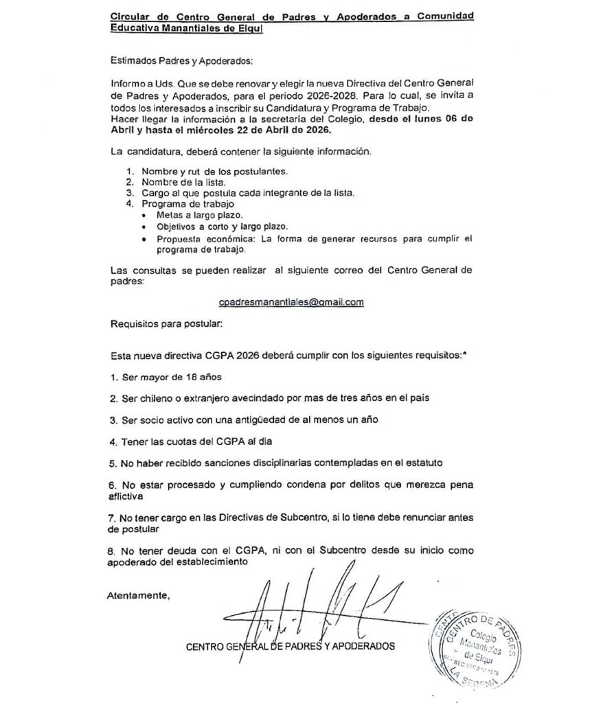 CIRCULAR DE CENTRO GENERAL DE PADRES Y APODERADOS A COMUNIDAD EDUCATIVA MANANTIALES DE ELQUI.Por Colegio Manantiales / 10 de abril de 2026